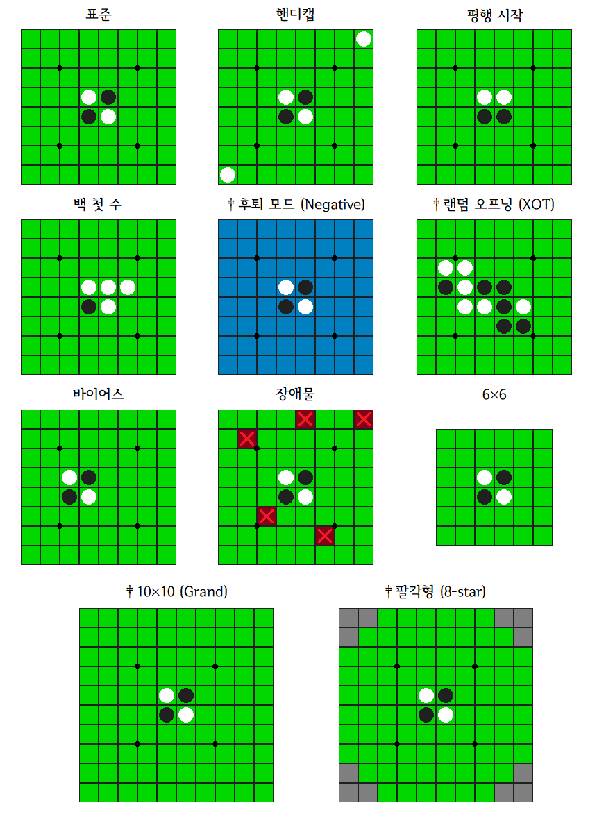 ◆ ‡10×10: 그랜드 모드라고도 불린다. 칸의 개수는 100개, 게임 내에서 96수까지 진행한다. 공간이 넓어진 만큼 소요 시간도 길고 변의 비중이 표준보다는 살짝 내려간다. 또한 오프닝 별 유불리가 덜 알려져 있으므로 오프닝 북의 의존도가 크게 내려간다. eOthello에서 플레이 가능.